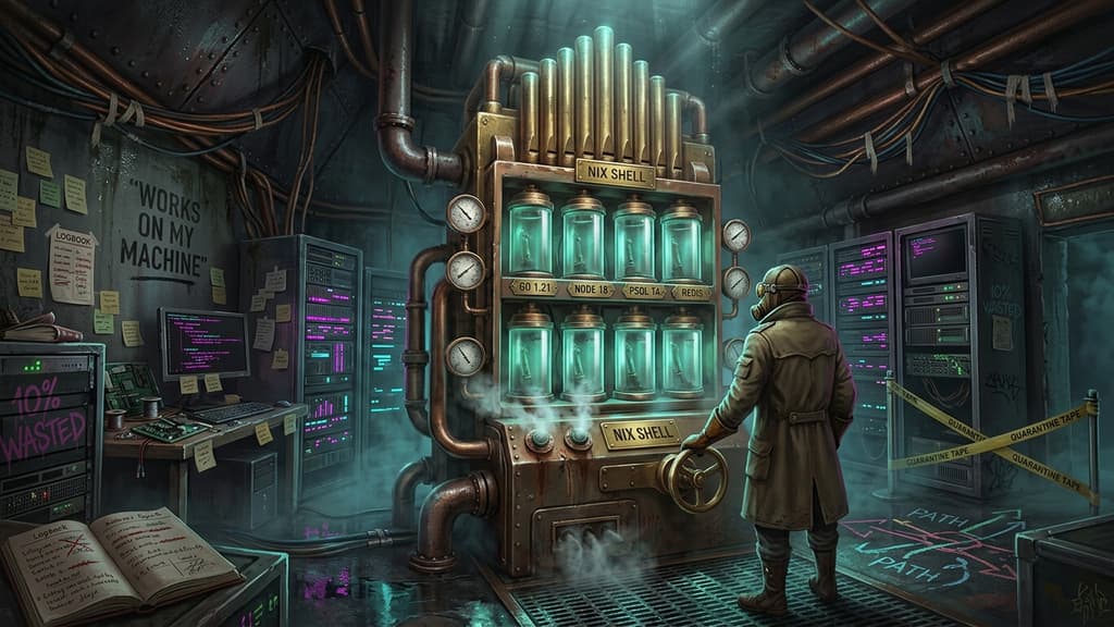 With Nix, the entire environment—Go 1.21, Node.js 18, Docker, PostgreSQL 14, Redis, build tools, everything—gets declared in one shell.nix file. Every developer runs nix-shell and gets identical environments in minutes. The extensive setup process becomes unnecessary. The version conflicts disappear. The database and cache versions are consistent. The PATH issues can't happen because Nix isolates everything. The same environment works identically for everyone, in CI, in deployment scripts, next week, next month, next year, until someone deliberately changes the environment definition.