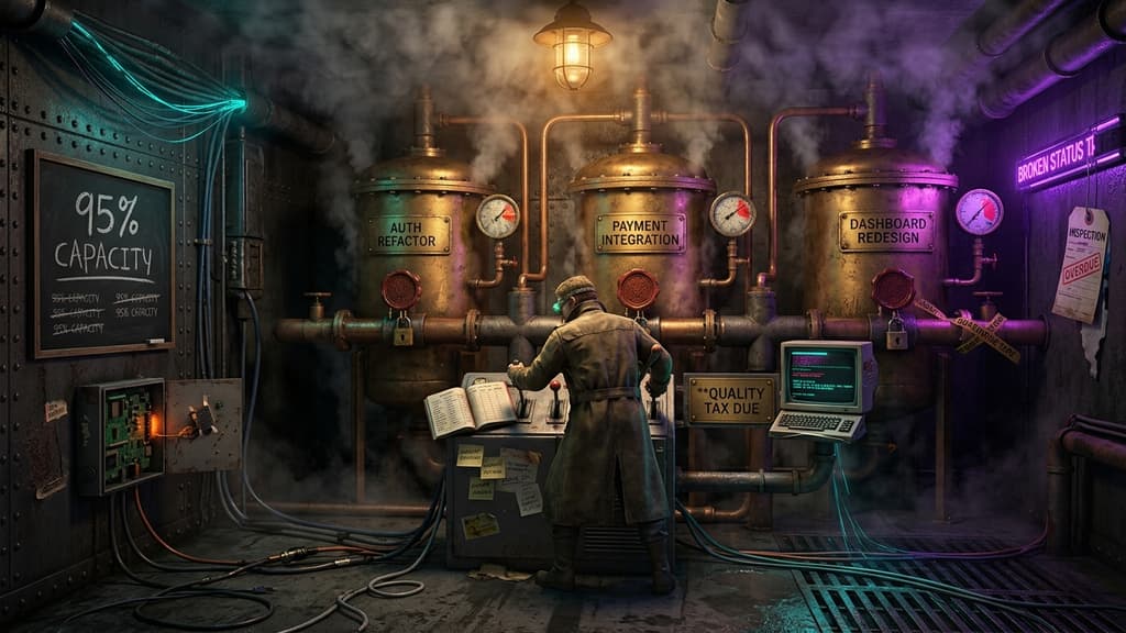 The patterns that emerge from overcommitted sprints are predictable. Teams break large features into tiny sprint-sized pieces, creating artificial dependencies where developers implement partial solutions requiring complex integration later. This story fragmentation introduces interface bugs and architectural inconsistencies. Multiple developers work on related features simultaneously without constant coordination, creating merge conflicts, duplicated work, and integration bugs when features finally combine. Mid-sprint scope changes force developers to rapidly context switch to unfamiliar code areas, increasing the likelihood of introducing defects. And throughout it all, overcommitted sprints push refactoring and technical debt resolution to "later", creating an accumulating burden that makes future development more error-prone.