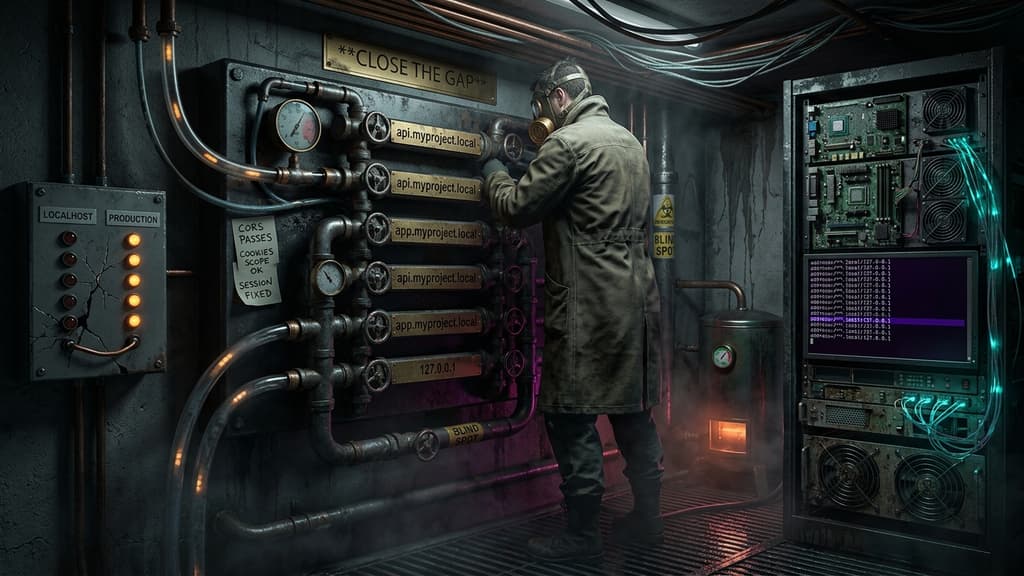 I remember debugging a session management issue that appeared only when the application ran on a proper domain, not on localhost. The cookies were set with domain restrictions, and localhost didn't trigger the same code paths as the production domain. I'd caught the bug three hours before launch, only because I happened to test against a staging server. The fix took ten minutes. Finding it took three hours of confusion. Had I been testing with proper local domain names from the start, the issue would have been obvious during initial development.