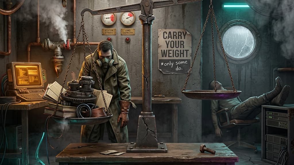 Stage three: redistribution. The work the underperformer isn't doing migrates to the people who care enough to pick it up. This happens through a thousand small decisions, each individually insignificant. Someone fixes a colleague's buggy code rather than sending it back because the deadline is tomorrow. Someone rewrites documentation rather than waiting for a revision that will never come because users are complaining. Someone picks up a dropped task rather than letting a deadline slip because they cannot bring themselves to watch something fail. None of these decisions are assigned. None of them are acknowledged. They are the invisible labour of conscientiousness, and the team continues to function — possibly even well by external measures — because the load-bearing members refuse to let it collapse. But the load has shifted dramatically onto the shoulders of the people least likely to complain about it, and the people it shifted away from have learned that there are no consequences for letting it happen.